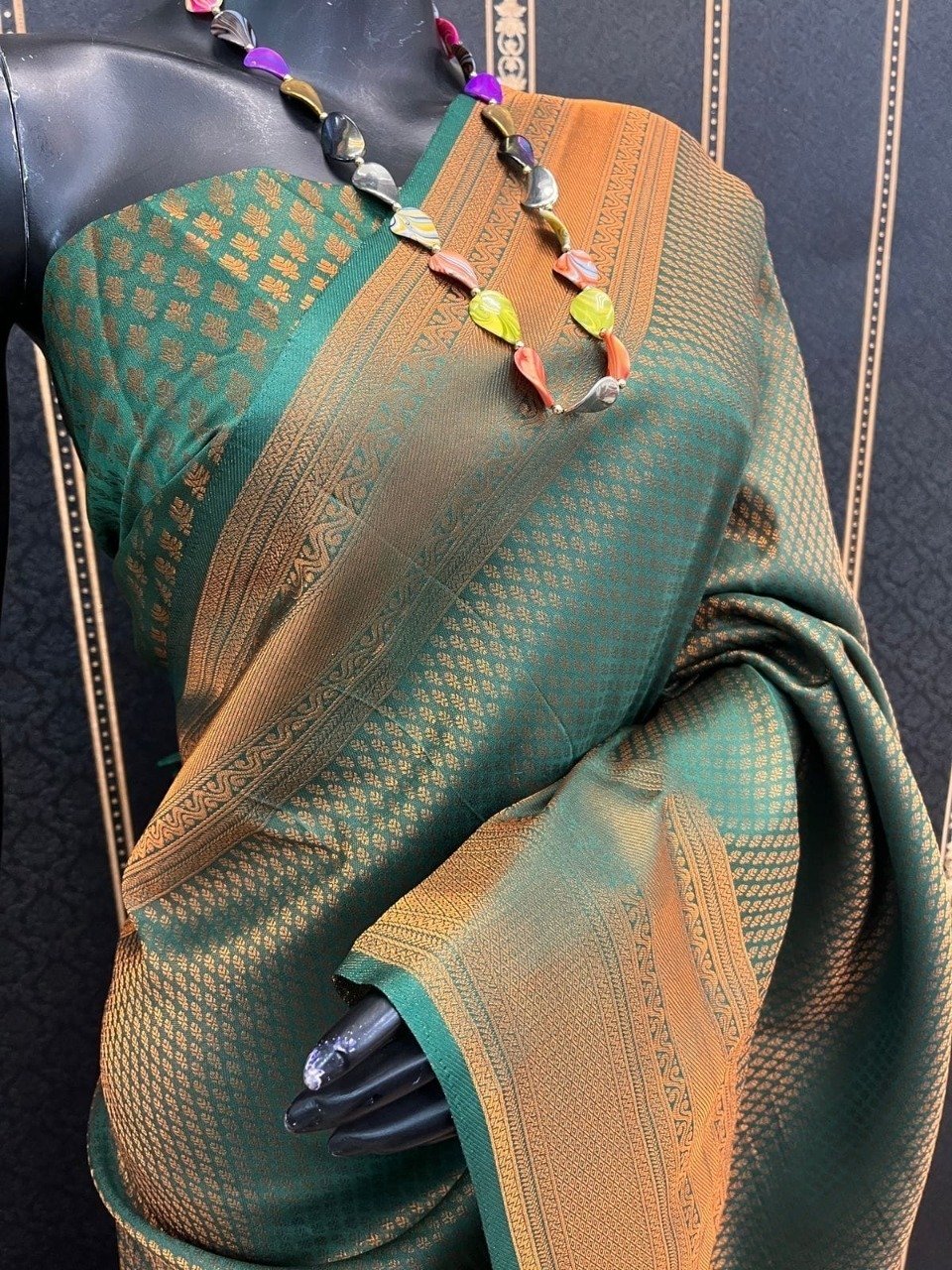 Perfect for weddings, family festivities, or even a sophisticated office party, this dark green lichi silk saree fits into diverse settings effortlessly. The fabric is lightweight yet luxurious, ensuring both comfort and style throughout the day. The color palette is carefully chosen to make it suitable for all skin tones, while the refined silk material exudes finesse. You’ll find yourself reaching for this saree whenever you wish to make an impression with your elegant and polished appearance.